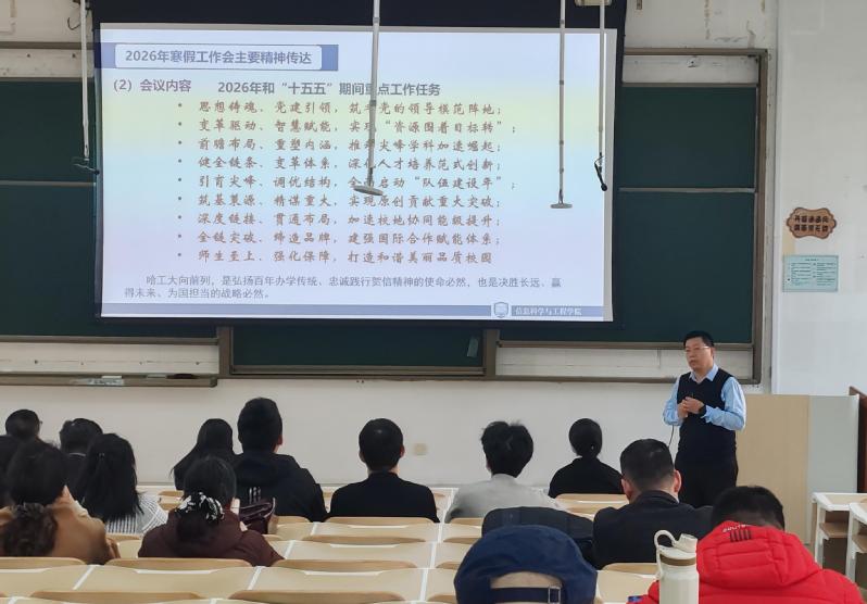 为凝聚发展力量,明确未来方向,近日,信息科学与工程学院召开全院教职工大会暨2026年重点工作部署会,学院全体教职工参会。会议由学院党委书记黄蕊主持,院长王晨旭做整体工作部署,副院长金涛、副书记慈艳艳、院长助理李剑锋分别就分管工作的重点任务安排进行了介绍。